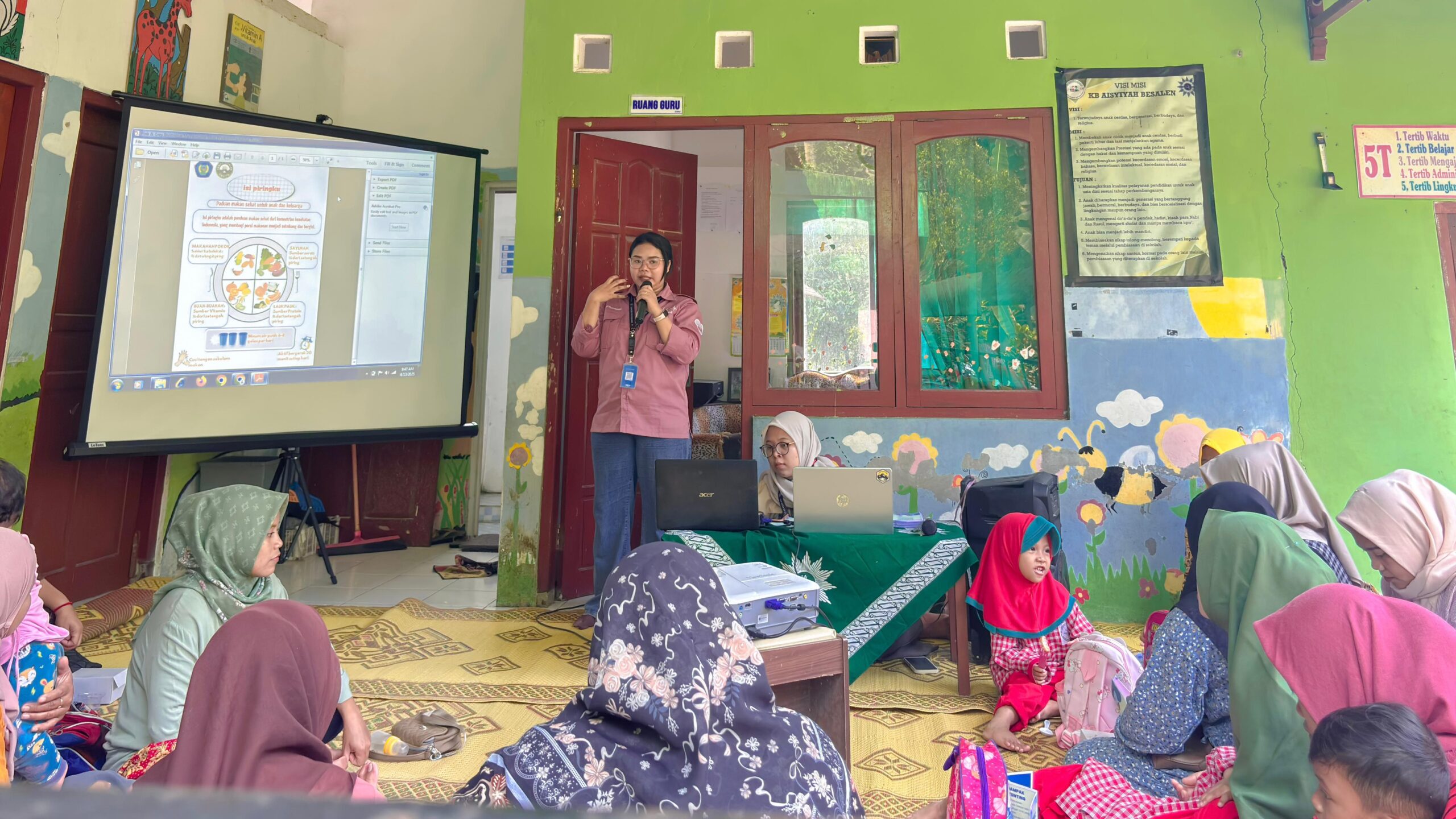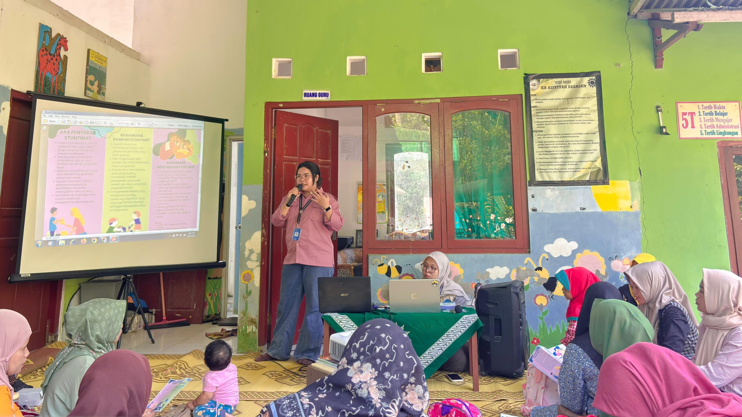 Dusun Besalen menjadi salah satu lokasi pelaksanaan Kuliah Kerja Nyata (KKN) Universitas Respati Yogyakarta tahun 2025. Mahasiswa KKN Unit 23 bersama masyarakat setempat menggelar kegiatan edukasi bertema “Brantas Stunting untuk Keluarga” yang berlangsung di PAUD KB Aisyiyah Besalen pada Rabu, 13 Agustus 2025. Kegiatan ini diikuti oleh 25 ibu wali murid dari total 30 undangan yang disebarkan di tiap RT di Dusun Besalen. Edukasi disampaikan melalui media presentasi powerpoint, poster, serta sesi tanya jawab interaktif sehingga peserta lebih mudah memahami materi yang diberikan. Materi edukasi mencakup pengenalan stunting, peran ibu dalam pencegahan stunting, pentingnya gizi seimbang berdasarkan pedoman “Isi Piringku”, serta praktik pola asuh yang mendukung pertumbuhan anak. Selain itu, peserta diberikan pengetahuan mengenai pentingnya konsumsi makanan bergizi seimbang seperti lauk hewani, nabati, sayur, dan buah guna mendukung tumbuh kembang optimal.